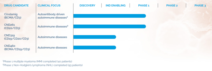 更关键的是,这些分子展现出优异的安全性特征。核心管线cizutamig(即CND106)可精准结合BCMA与T细胞CD3,介导T细胞对表达BCMA阳性的B细胞产生特异性杀伤,实现组织层面的深度清除为疾病缓解奠定基础。